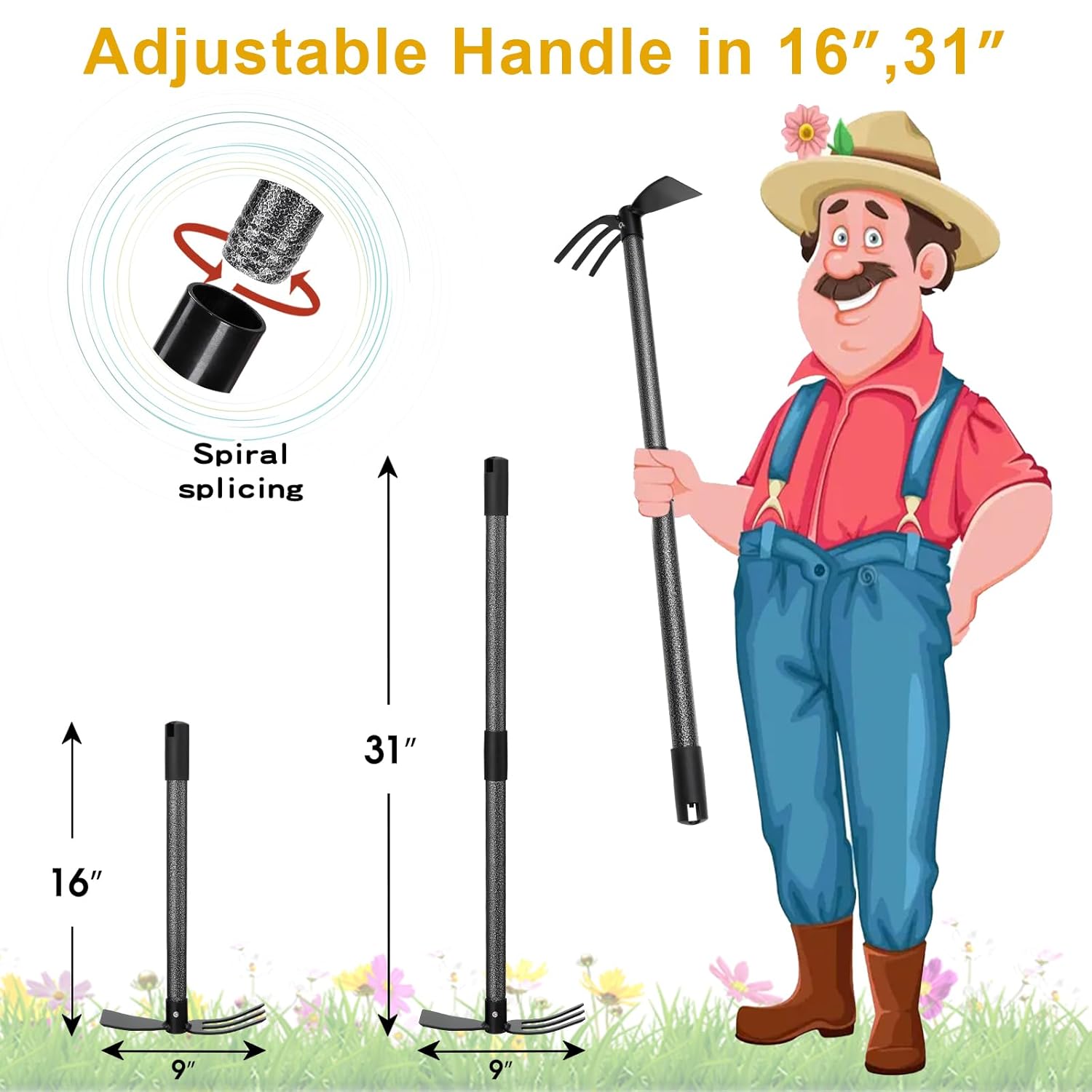 Houe et cultivateur: C’est un combo 2 en 1 de houe et de cultivateur à main avec poignée réglable, parfait pour le jardinage, l’aménagement paysager, le désherbage, le creusage, le semis, le desserrage du sol, la culture des légumes, l’arrachage des mauvaises herbes