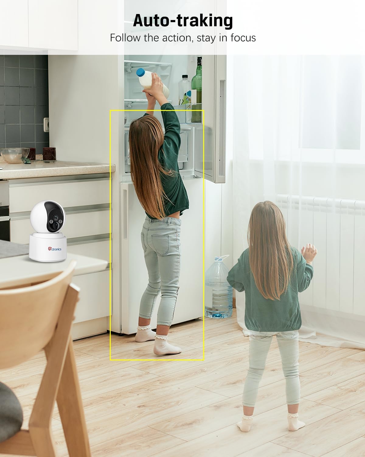 – Suivi automatique : La fonction de suivi automatique suit les mouvements détectés, vous garantissant ainsi une couverture complète de votre espace. Cela vous permet de garder un œil sur tout ce qui se passe, même lorsque vous n’êtes pas présent.