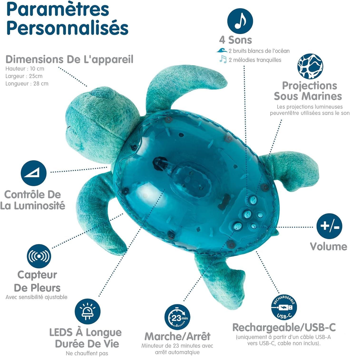 Imaginez votre enfant s’endormant paisiblement sous la douce lumière projetée par la Tortue Tranquille. Elle diffuse des vagues de l’océan en mouvement sur le plafond, créant une atmosphère réconfortante. Avec deux mélodies sous-marines apaisantes et deux sons de l’océan, votre enfant sera plongé dans un cocon de tranquillité.