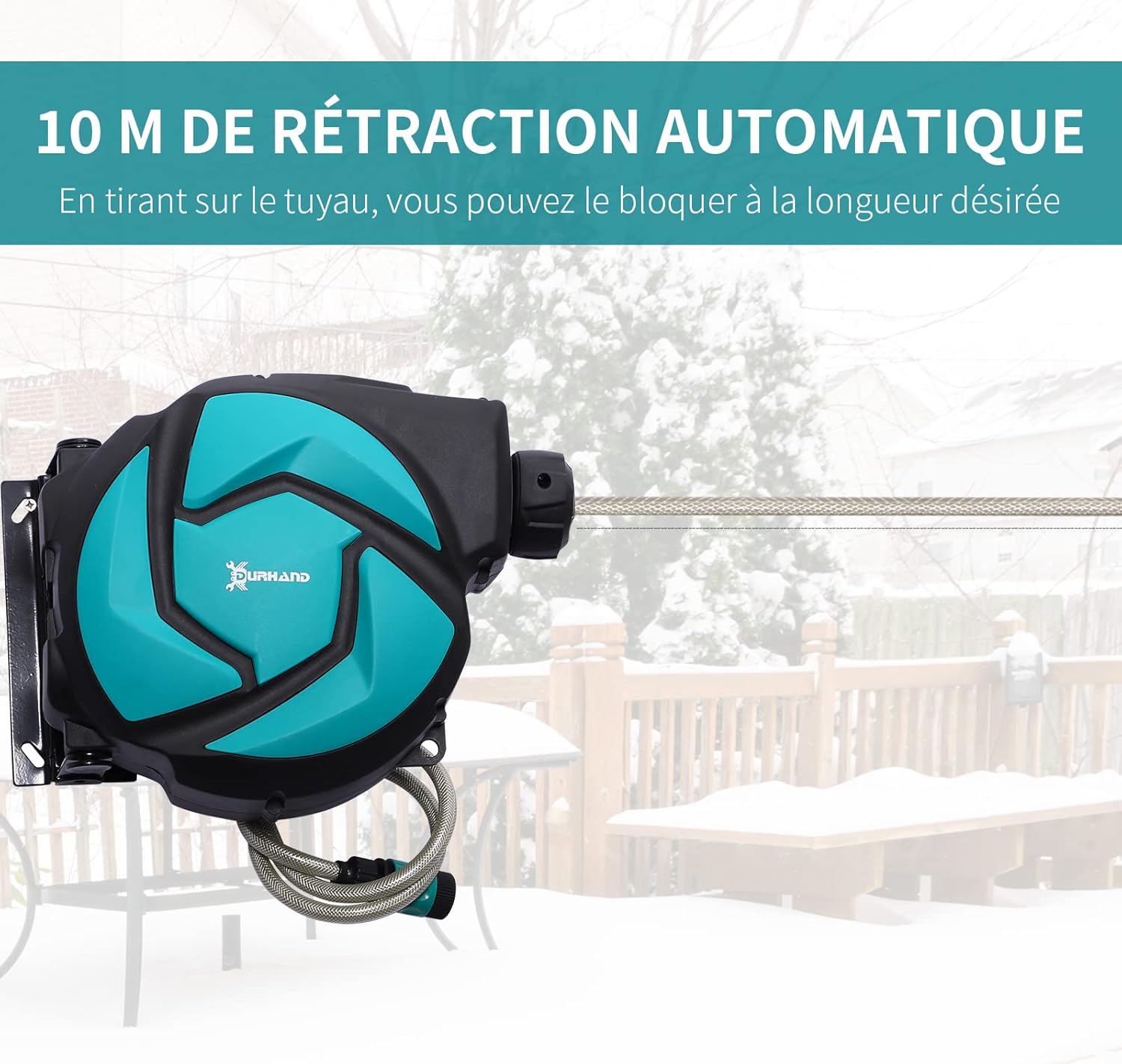 – Système d’enroulage automatique : Fini les nœuds et les enchevêtrements de tuyaux. Il suffit d’un simple tirage pour déployer le tuyau, et il s’enroule automatiquement lorsque vous avez fini d’arroser.