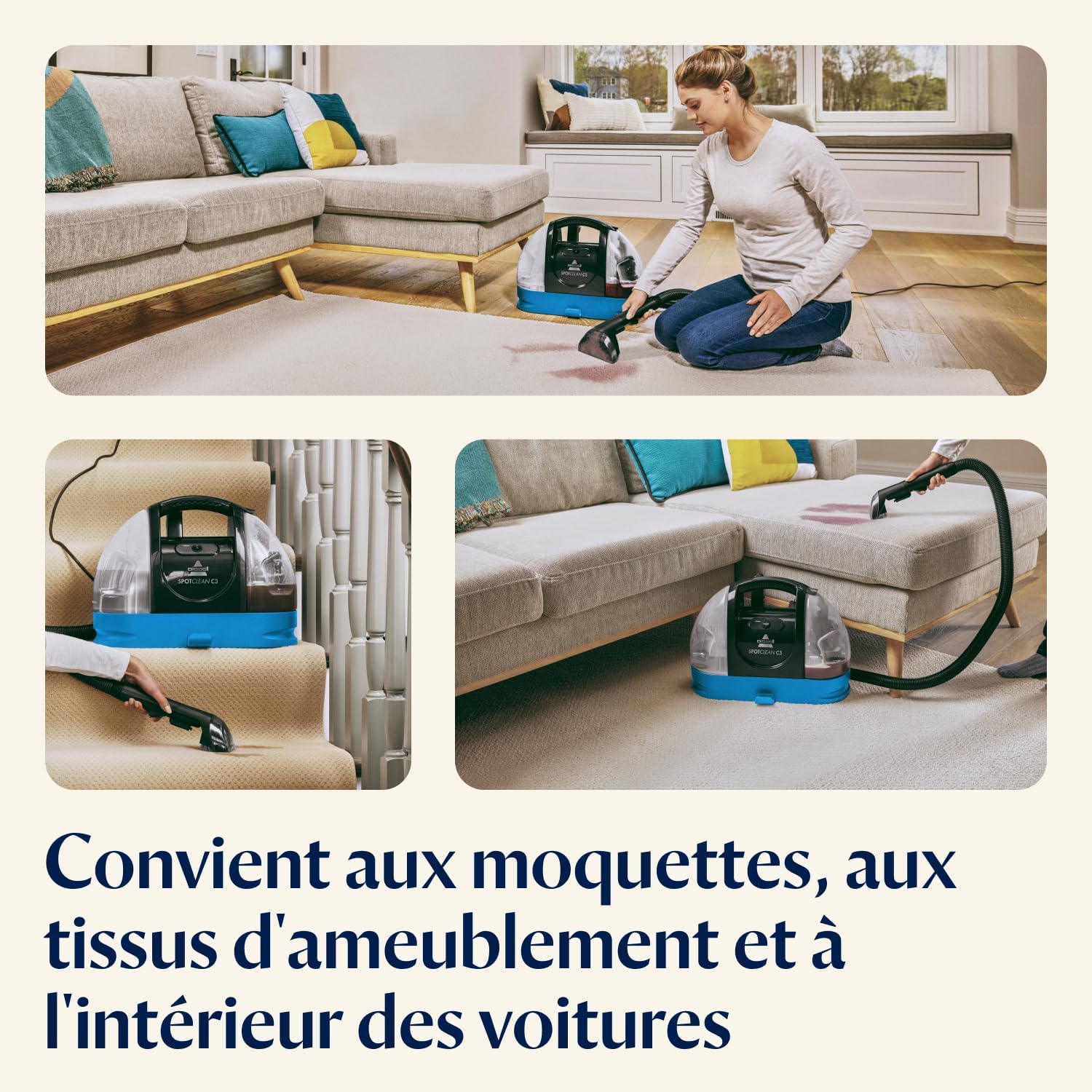 BISSELL SpotClean C3 est une machine puissante au design pratique. Combinant une aspiration supérieure, une action de frottement et une solution de nettoyage BISSELL spécialement formulée, cette machine peut éliminer les saletés dans tous les recoins de votre maison. Idéal pour les tissus d’ameublement, les tapis, les moquettes et les escaliers, le SpotClean C3, équipé de nos outils spécialisés pour éliminer les taches tenaces, est une solution pratique pour nettoyer les maladresses du quotidien. Cet appareil dispose d’une technologie à deux réservoirs, conçue pour maintenir l’eau propre et la formule séparées de l’eau sale, afin que vous puissiez nettoyer en toute confiance en sachant que vous ne nettoyez jamais à l’eau sale. Lorsqu’il n’est pas utilisé, la taille compact du nettoyeur en profondeur portable SpotClean C3 permet de le ranger facilement dans une armoire ou un placard